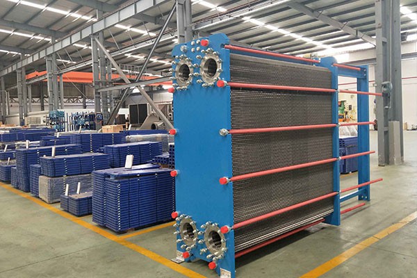 框架包括一個(gè)固定壓緊板和一個(gè)活動(dòng)壓緊板,由上導(dǎo)桿與下導(dǎo)桿支承,在另端有一支柱。兩種介質(zhì)經(jīng)固定(或活動(dòng))壓緊板上法蘭孔流入由波紋板片組成的各自通道,熱交換后介質(zhì)再由固定(或活動(dòng))壓緊板上的法蘭孔流出。同定壓緊板、活動(dòng)壓緊板、支柱及導(dǎo)桿均為低碳鋼??紤]到用戶的多種使用要求,框架設(shè)計(jì)有多種型式,主要有雙支撐框架式和常用的落地式等。